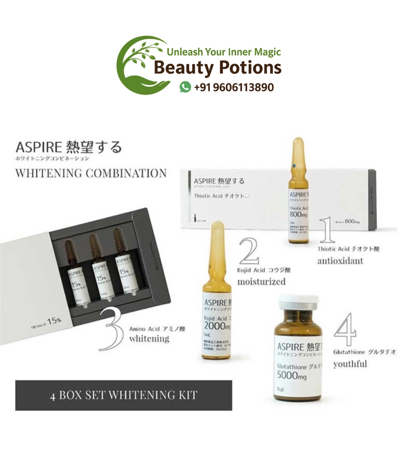 Introducing the Aspire Glutathione Japan Full Whitening Injections Set, a revolutionary skincare solution designed to bring out your skin's natural radiance and youthfulness. This premium product, made in Japan and now available in India, represents the pinnacle of skincare innovation, combining advanced science with nature's most potent ingredients for an unparalleled skin whitening experience.